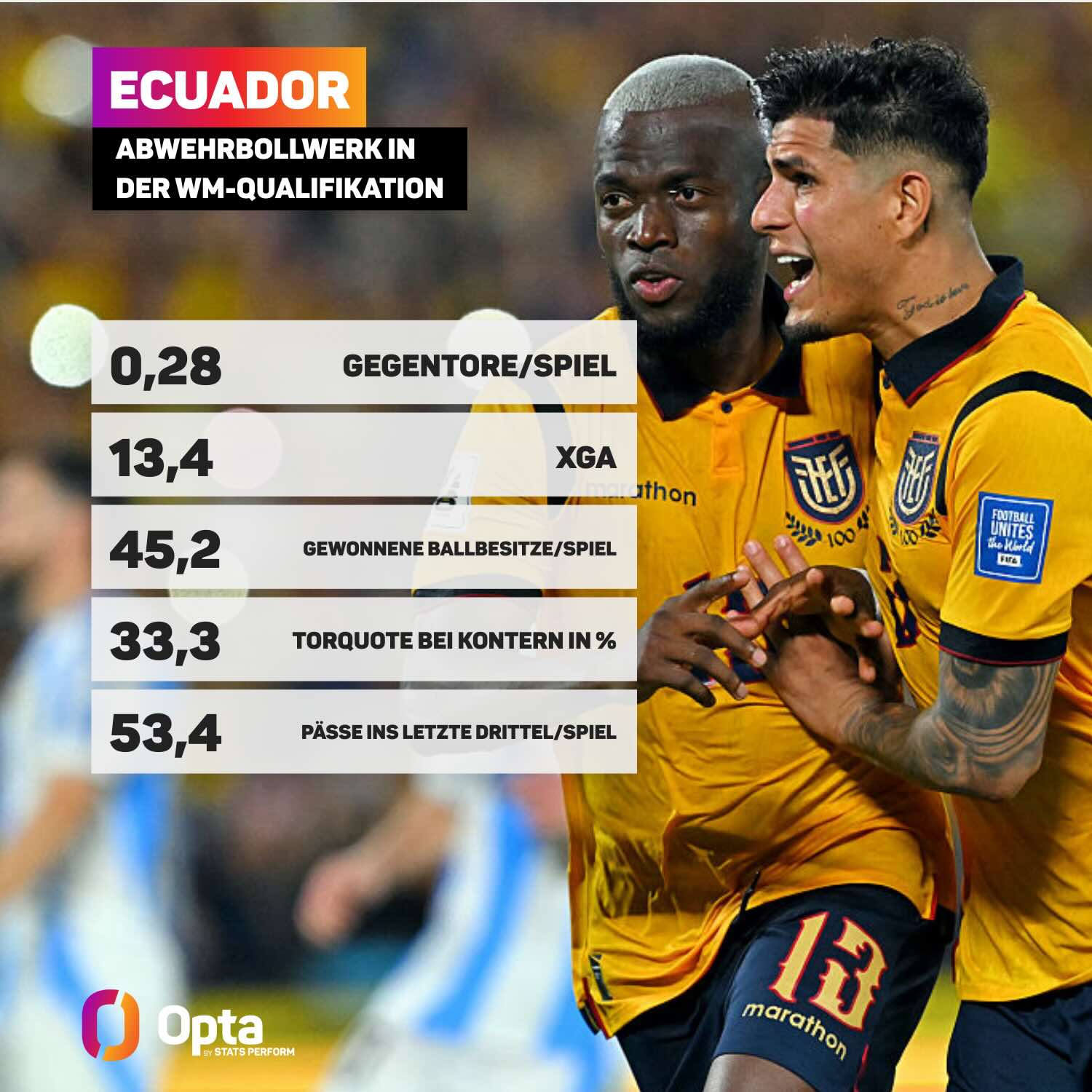 Im Rahmen der Qualifikation zur WM 2026 beeindruckte wohl kaum ein Team defensiv so sehr wie Ecuador. Das Team von Sebastián Becaccece kassierte in 18 Spielen trotz starker Gegner wie Weltmeister Argentinien, Brasilien oder Kolumbien insgesamt nur fünf Gegentore. Wenngleich man bei einem xGA-Wert von 13,35 („nur“ drittbester Wert) defensiv durchaus überperformte, kontrollierte man viele Partien am eigenen Ende des Feldes mit einer straffen Organisation, einem kollektiven Pressing und einer starken physischen Präsenz.