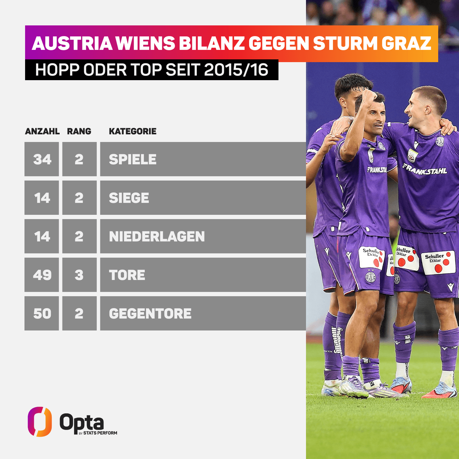 Insgesamt haben die Violetten sogar seit fünf Bundesligaspielen nicht mehr gegen die Grazer verloren (3 Siege, 2 Unentschieden) – ihre längste Serie seit 2012 bis 2014 (damals 6 Duelle ungeschlagen) – und in den jüngsten drei Bundesligaauswärtspartien immer Zählbares aus der Grazer Merkur Arena mitgenommen (2 Siege, 1 Unentschieden).
