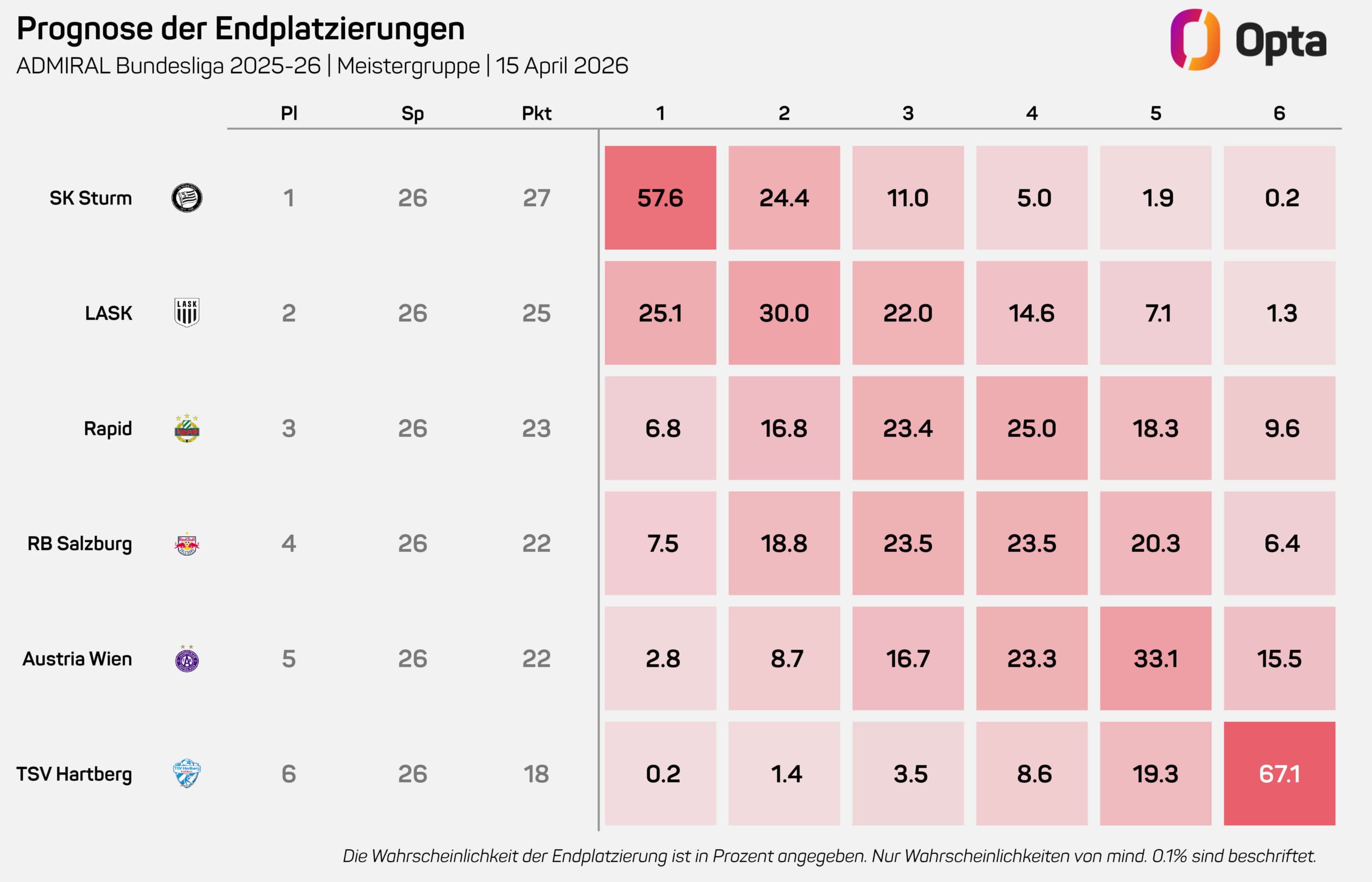 In der Meistergruppe bleibt Sturm Graz trotz leicht gesunkener Titelquote die Mannschaft mit den besten Karten. Die Grazer stehen bei 27 Punkten und werden vom Opta Supercomputer in 57,6% der Fälle als Meister projiziert. Das ist kein erdrückender Vorsprung mehr, aber immer noch die klar beste Ausgangsposition. Dahinter hat sich der LASK in Stellung gebracht: 25,1% Titelchance bei nur zwei Punkten Rückstand machen die Linzer zum realen Herausforderer. Noch vor kurzer Zeit war der LASK eher Teil eines breiten Verfolgerfelds – jetzt ist er der Klub, der Sturm unter Druck setzen kann.