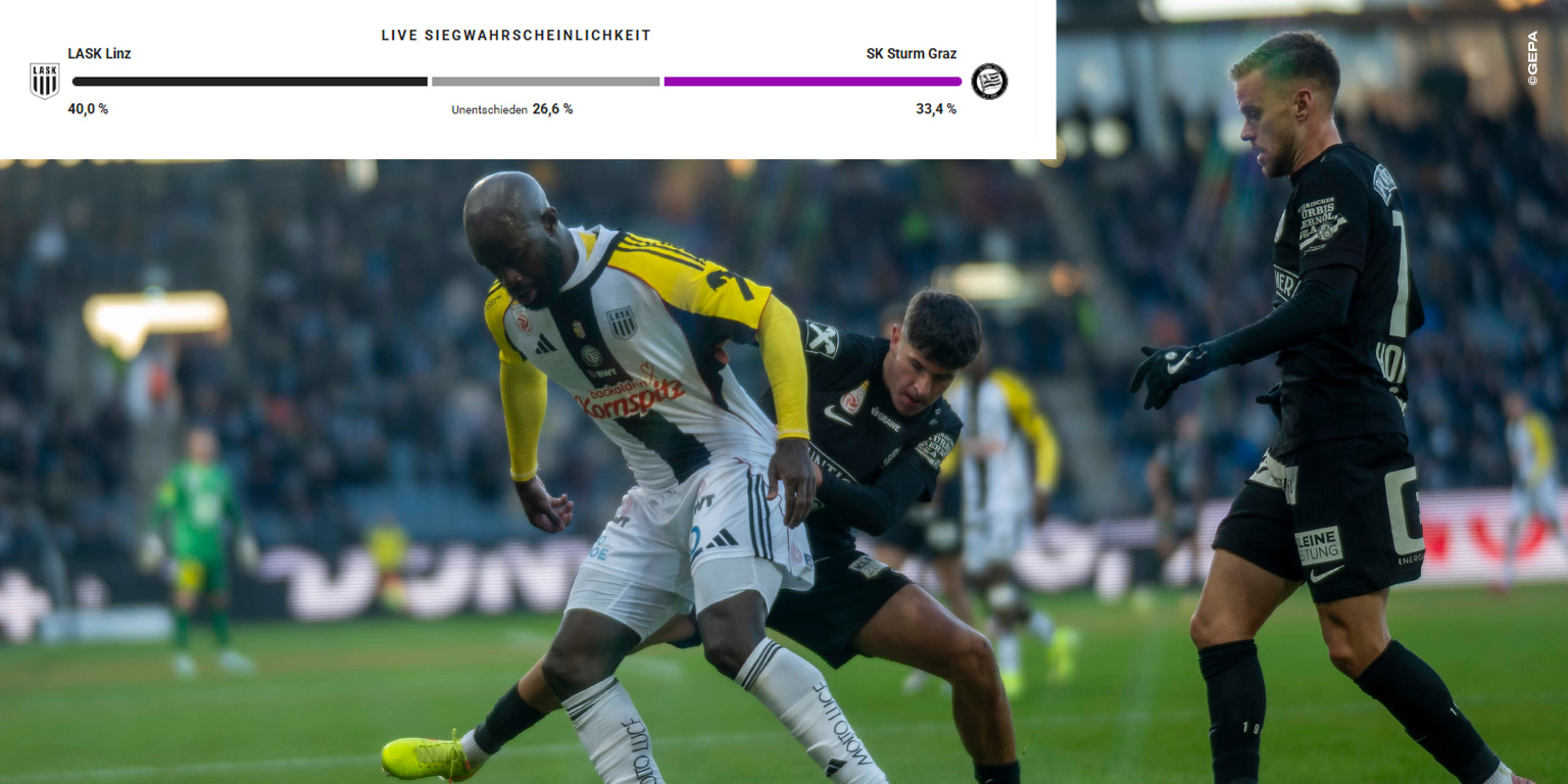 Und genau dieses direkte Duell ist das Topspiel des kommenden Spieltags. LASK gegen Sturm Graz bedeutet nicht nur Zweiter gegen Erster, sondern ist ein Duell, das in die Linzer Historie eingehen könnte: Mit einem Sieg würde der LASK die Tabellenführung übernehmen und damit erstmals so spät in einer Bundesliga-Saison an der Spitze stehen. Gleichzeitig reist Sturm mit sieben Liga-Spielen ohne Niederlage an und hat die eigene historisch beste Auswärtsbilanz aus den ersten 13 Gastspielen im Gepäck: neun Siege und 28 Auswärtstore. Der LASK wiederum gewann sechs seiner acht Heimspiele seit der Rückkehr von Dietmar Kühbauer. Für die Begegnung am Sonntag sieht der Opta Supercomputer den LASK mit einer Siegwahrscheinlichkeit von 40% knapp in der Favoritenrolle, aber auch ein Sieg der Grazer ist mit einer Wahrscheinlichkeit von 33,4% alles andere als ausgeschlossen.