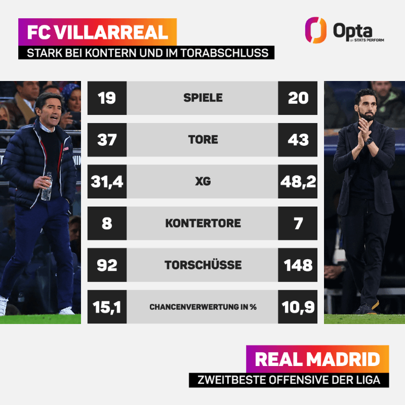 Beim letzten direkten Aufeinandertreffen im Oktober 2025 hatte Real keine allzu großen Schwierigkeiten mit dem Gelben U-Boot. Beim 3:1-Heimerfolg kamen die Blancos auf 26 Schüsse (7 Torschüsse) und dominierten die Partie mit einer Ballbesitzquote von 70 Prozent. Überhaupt lief es in La Liga zuletzt durchaus rund für die Madrilenen. Nur eine ihrer letzten 13 Partien ging verloren (9 Siege, 3 Unentschieden), die letzten vier Ligaspiele wurden bei einem Torverhältnis von 11:2 gar allesamt gewonnen. Abgesehen von den Niederlagen in Albacete und in der Supercopa auf neutralem Boden (Saudi-Arabien) ist man zudem auswärts seit der 0:1-Pleite in der Champions League in Liverpool Anfang November ungeschlagen (5 Siege, 3 Unentschieden). Mit einem Sieg in Villarreal würden die Königlichen zum besten Auswärtsteam der laufenden La-Liga-Saison avancieren (21 Punkte in 10 Spielen).