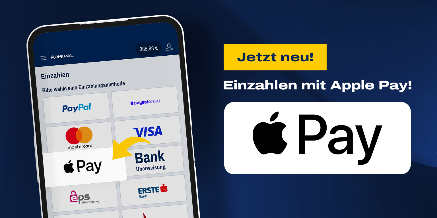 ADMIRAL hat seine Einzahlungsmöglichkeiten erweitert: Ab sofort steht unseren Kunden mit Apple Pay eine weitere, besonders komfortable Einzahlungsmethode zur Verfügung. Damit wird der Zahlungsprozess vor allem für Nutzer von iPhone, iPad oder Mac nicht nur schneller, sondern auch deutlich unkomplizierter.
