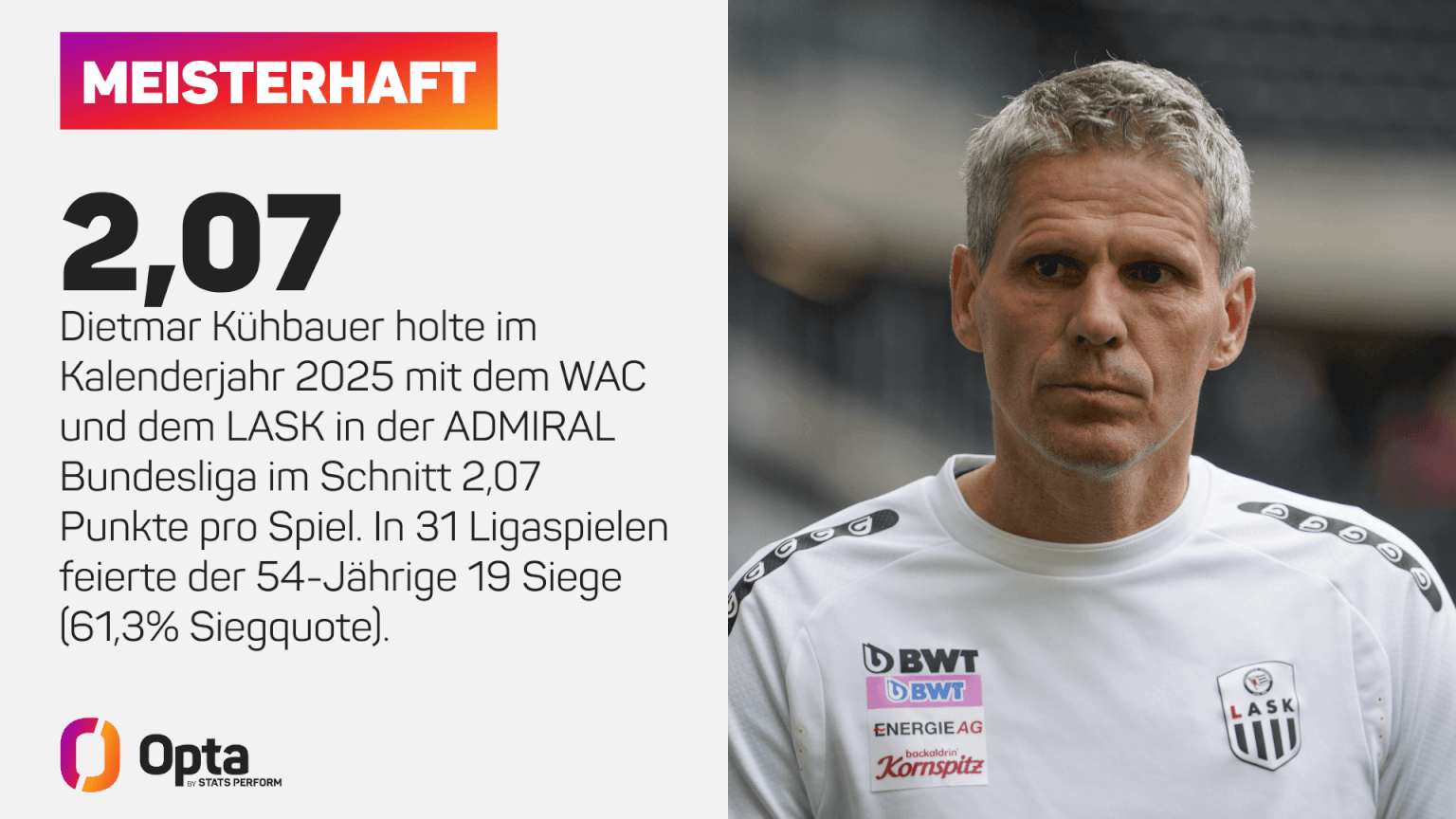 Mit dem Wolfsberger AC verpasste Dietmar Kühbauer in der zurückliegenden Saison erst am letzten Spieltag die österreichische Meisterschaft, nun nimmt der „Trainer des Jahres 2025“ nach seinem überraschenden Wechsel mit dem Linzer ASK einen neuen Anlauf. Die ersten sechs Ligaspiele mit seinem neuen Verein gewann der gebürtige Wiener allesamt, vom vorletzten Platz hat der 54-Jährige die Oberösterreicher bis auf einen Punkt an Tabellenführer FC Red Bull Salzburg herangeführt. Doch ist der LASK wirklich reif für den Meistercoup in der ADMIRAL Bundesliga? Oder droht nach dem Höhenflug die Bruchlandung?