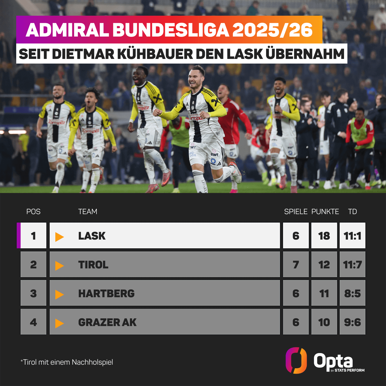 Auch vor dem kommenden Winter-Transferfenster müssen sich LASK-Fans wohl nicht fürchten. In Linz gilt die platte Attitüde: Die Mannschaft ist der Star. Zwar sind Spieler wie Innenverteidiger Andrés Andrade, der dänische Neuzugang Kasper Jörgensen oder auch das Sturmduo Moses Usor (4 Tore, 3 Vorlagen) und Samuel Adeniran (3, 3) wichtige Stützen in Kühbauers Spiel, doch allgemein verteilt sich der Erfolg des Teams eher auf eine geschlossene Mannschaftsleistung, die einem klaren Plan des Trainers folgt. Und solange Kühbauers Erfolgsrezept wirkt – und die Konkurrenz um Sturm und RB Salzburg regelmäßig auslässt – ist der LASK ein echter Titelanwärter, sowohl in der Meisterschaft als auch im Cup. Vielleicht krönt sich Kühbauer sogar zum Doublesieger – ohne „beinahe“. Auch wenn der Opta Supercomputer die Titelchancen aktuell bei RB Salzburg (36.41 Prozent) und Sturm Graz (35.47 Prozent) noch höher einschätzt als beim LASK (11.24 Prozent).