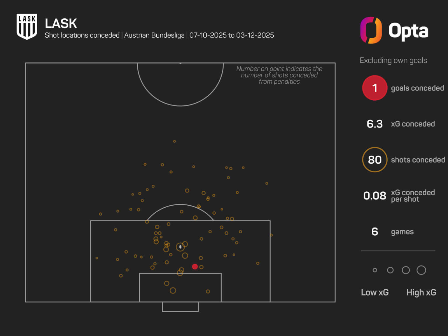 Am signifikantesten und offensichtlichsten ist die defensive Stabilität der Linzer. Kassierte der LASK noch 17 Gegentore in den ersten neun Ligaspielen, so ließen die Oberösterreicher nach Kühbauers Übernahme nur noch ein Gegentor in sechs Partien der ADMIRAL Bundesliga zu – beim 3:1-Auswärtssieg bei Meister Sturm Graz. Der Expected-Goals-Against-Wert pro Spiel von 1,98 wurde beinahe halbiert (1,05), im Zeitraum ab dem 10. Spieltag weist Linz den zweitniedrigsten xGA-Wert (6,29) der Liga auf und liegt auch bei zugelassenen gegnerischen Schüssen auf das Tor (20, Platz 3; 80 Schüsse insgesamt zugelassen) und Fehlern, die direkt zu gegnerischen Torschüssen führten (2, Platz 2) im Ligavergleich weit vorne – und das, nachdem man an den ersten neun Spieltagen noch den höchsten xGA-Wert (17,8) aufwies und die viertmeisten gegnerischen Torschüsse (40) zugelassen hatte. Satte elf Fehler, die einem Torschuss des Gegners vorausgingen (Liga-Höchstwert), führte Datenlieferant Opta zu dem Zeitpunkt bereits auf. Kühbauer und der Wolfsberger AC gehörten da noch zur Ligaspitze.