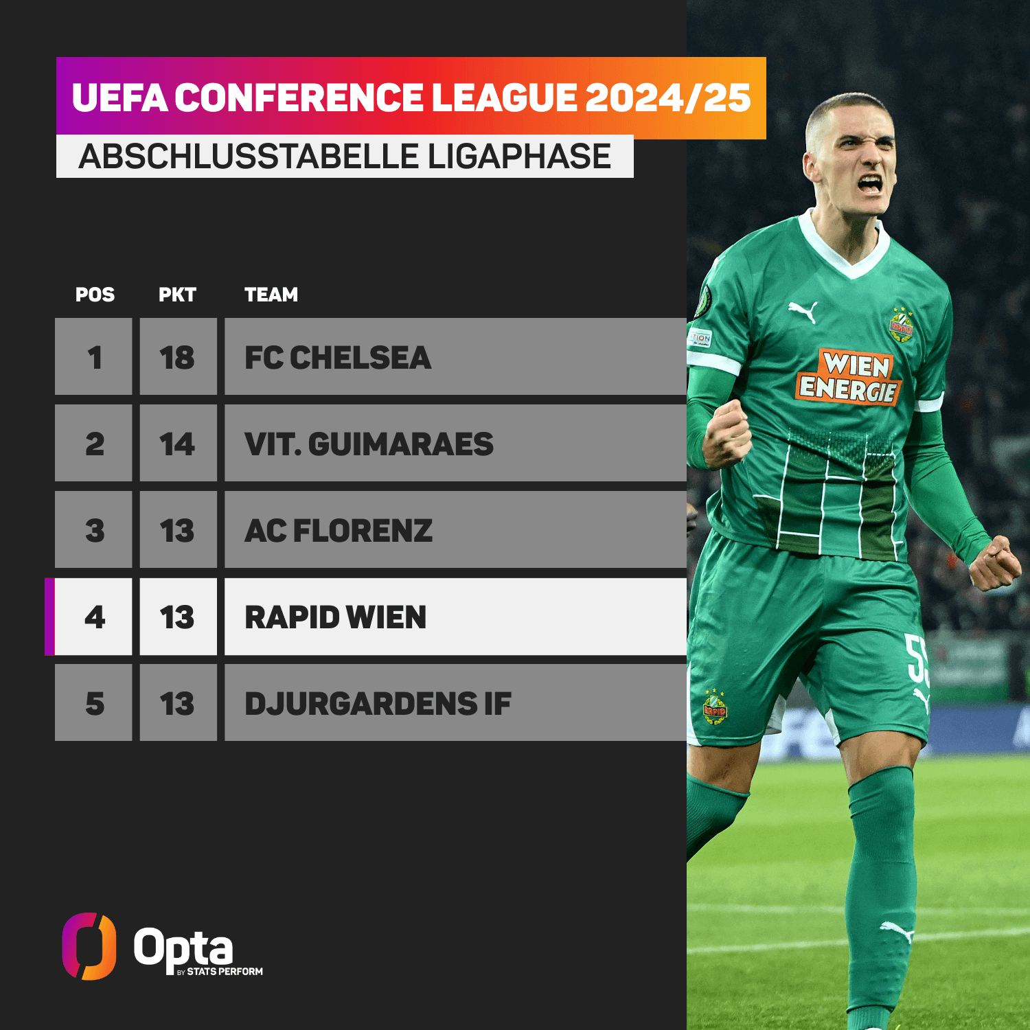 Letztlich ein voller Erfolg für die Wiener, die in beiden Jahren davor bereits jeweils in der Conference-League-Qualifikation (2023/24 gegen die AC Florenz, 2022/23 völlig überraschend gegen den FC Vaduz) ausgeschieden waren. Insgesamt gewann Rapid sechs seiner zehn Spiele, lediglich zweimal ging man als Verlierer vom Platz (2 Remis). In jedem Spiel trafen die Grün-Weißen mindestens einmal (16 Tore).