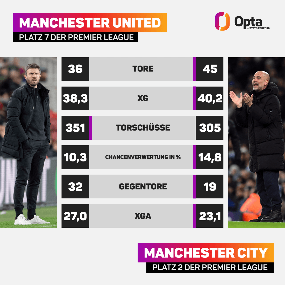 Auch in diesem Jahr wird es für United schwierig werden, gegen den Rivalen zu treffen. Nur Arsenal (14) hat weniger Gegentore als Manchester City (19), auch bei den Expected Goals Against (23,13), den zugelassenen Schüssen (193) und den zugelassenen Schüssen auf das eigene Tor (68) sind nur die Gunners besser als die Skyblues. United auf der anderen Seite gibt zwar die meisten Schüsse der Liga ab (351, davon 119 auf das Tor, ebenfalls Bestwert), verwertet aber nur jeden zehnten seiner Schüsse – nur vier Teams haben eine schlechtere Chancenverwertung in der Premier League.