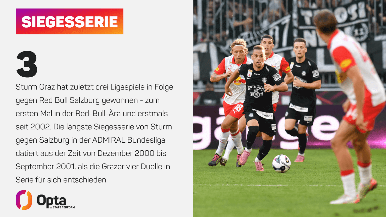 Überhaupt entwickelten sich die Steirer zuletzt zum Angstgegner der Roten Bullen. Immerhin hat Sturm die letzten drei direkten Duelle allesamt gewonnen. Mit einem Erfolg am Sonntag könnten das Säumel-Team die längste Siegesserie von Sturm gegen Salzburg einstellen. Vier Siege in Folge gab es zuletzt von Dezember 2000 bis September 2001. Auch der Datenanbieter Opta sieht die Gastgeber in der Favoritenrolle und kalkuliert eine Siegeswahrscheinlichkeit für Sturm von 48,1 Prozent, die Mozartstädter kommen nur auf 25,9 Prozent. Eine Wette auf einen Sturm-Sieg lockt dabei mit einer attraktiven Quote von 2,30.