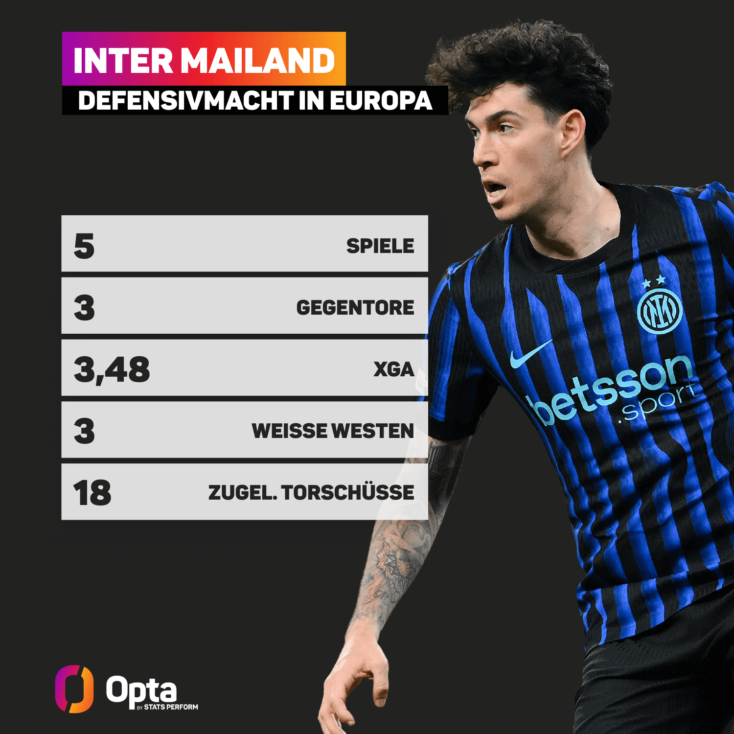 Zu verdanken haben dies die Italiener vor allem ihrer starken Defensive. Mit nur drei Gegentreffern bei einem Expected-Goals-Against-Wert von 3,48 stellt Inter nach dem FC Arsenal (1 Gegentor, 2,59 xGA) die zweitbeste Abwehr im Wettbewerb. Das Team von Trainer Cristian Chivu hat erst 47 Schüsse (Platz 5) und 18 Torschüsse (Platz 6) zugelassen, in drei ihrer fünf Spiele blieb Inter gänzlich ohne Gegentor. Die Abwehr der Nerazzurri hat dabei noch nicht einen einzigen Fehler begangen, der zu einem Abschluss geschweige denn einem Gegentor geführt hat.
