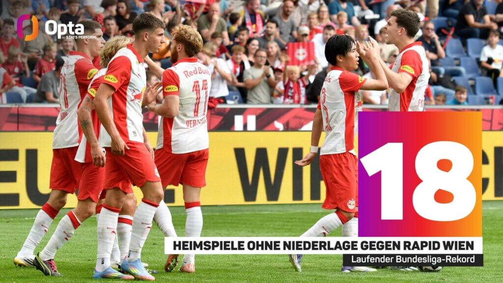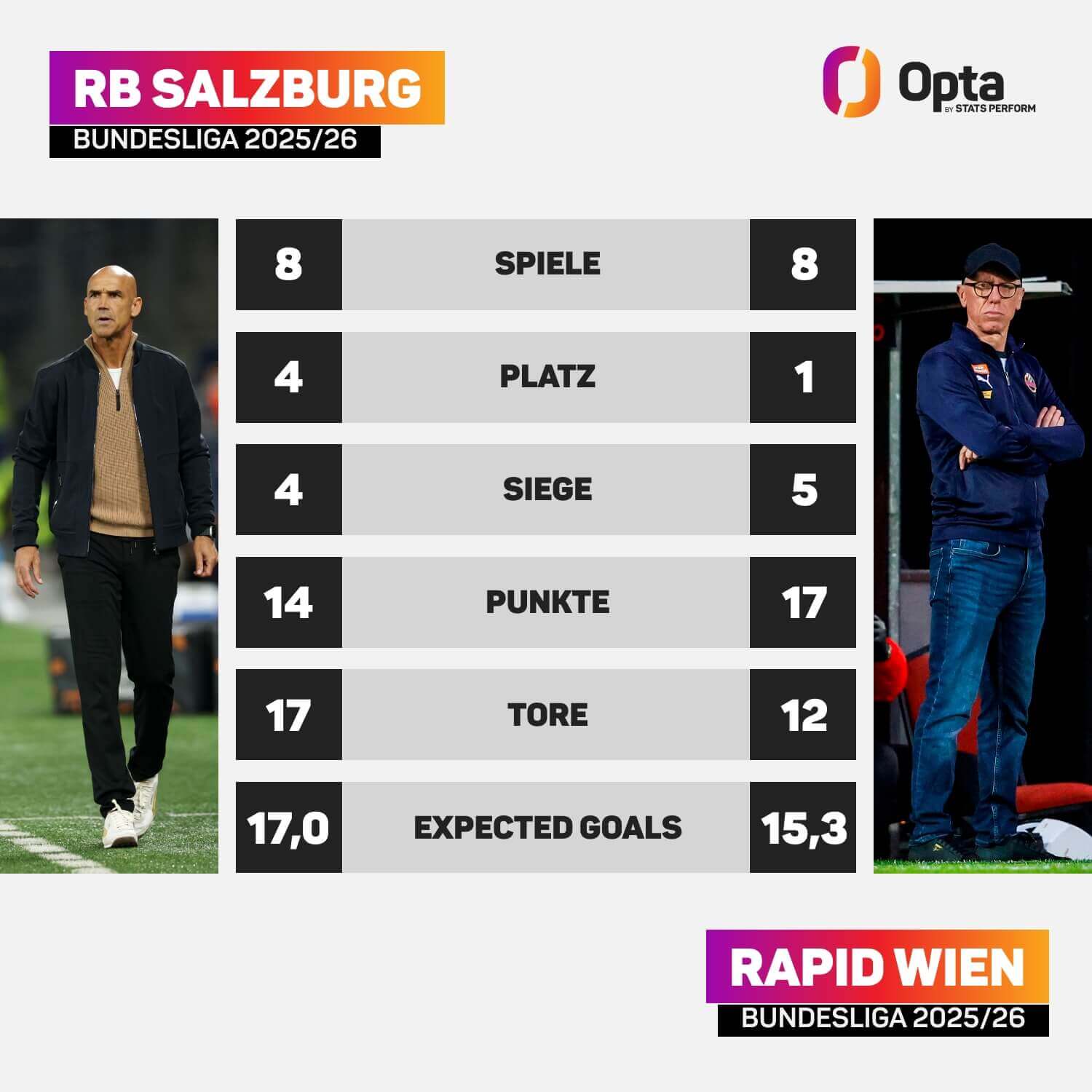 Salzburg auf der anderen Seite hat die neue Saison historisch schwach eröffnet. Trotz des 2:1-Erfolgs in Tirol vor einer Woche stehen nur 14 Punkte nach den ersten acht Runden zu Buche – der niedrigste Wert für die Roten Bullen seit der Ligareform 2018/19. Aus den ersten vier Heimspielen in der Liga holte RBS zudem nur sieben Punkte (2 Siege, 1 Unentschieden, 1 Niederlage) – so wenige wie zuletzt 2015/16 (auch 7). Sollte das Team von Trainer Thomas Letsch nach der 0:2-Heimpleite gegen Sturm Graz zuletzt auch gegen Rapid verlieren, würde man erstmals seit zwei Jahren wieder zwei Bundesliga-Heimniederlagen in Folge kassieren.